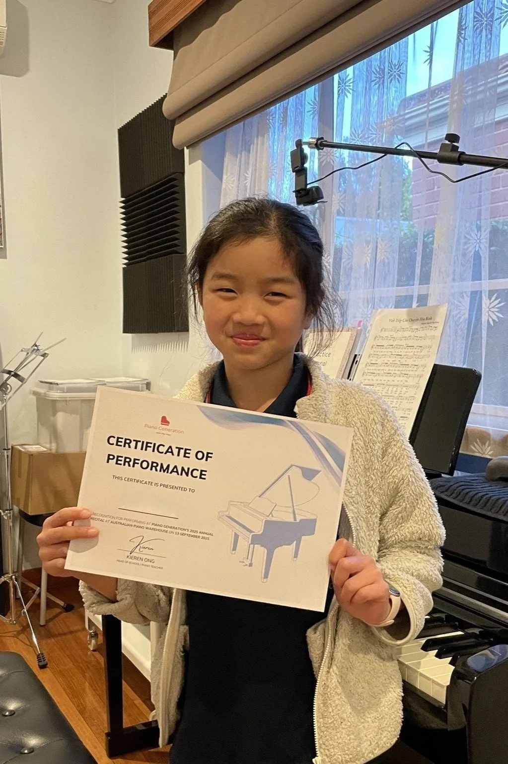Alexia began her piano journey with us in January 2024 with no prior experience. Through her dedication and consistent practice, she has made fantastic progress, now playing pieces hands together with confidence. Alexia genuinely enjoys music, and it shows in her playing. She has also performed twice at our studio recitals, growing in both skill and confidence each time.